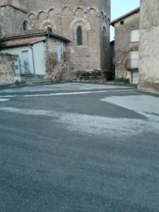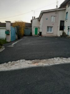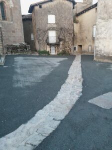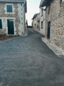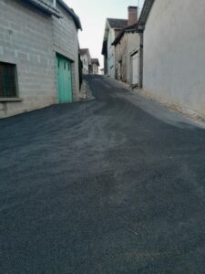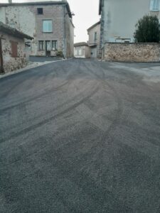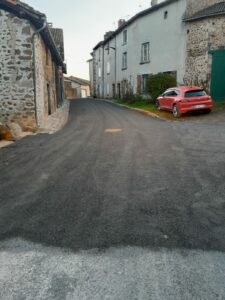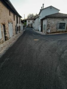 Après les caniveaux, le revêtement des rues Mariotoux, Leproux, Cordonnier, Puisatier et la place de la Bauche est entièrement refait en bicouche noir. Les trottoirs à la sortie du Bourg en direction de Lesterps le long de la RD 166 ont été également refait en bicouche rose.